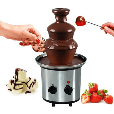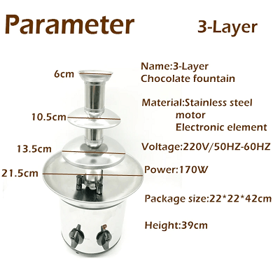 Odlicna cokoladna fontana sa tri sloja.  Ona je zabavna, intrigantna i pruža nam zadovoljstvo da se zasladimo! Banane, jagode, maline, višnje, trešnje ili neko drugo voće – izaberite i prepustite se uživanju! Visine je 39cm, precnika 20CM. Snage: 170W