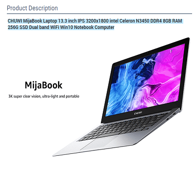 Brand: Chuwi Model: CHUWI MijaBook Operating System: Windows 10 Screen Size: 13.3” RAM Size: 8 GB Hard Drive Capacity: 256 GB Processor Type: Intel Celeron Graphic Card: Intel