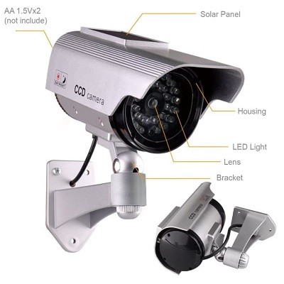 Koristi se i za unutrašnju i za spoljašnju upotrebu. Lako i brzo se instalira – nije potrebno ožičenje. Trepćuća LED dioda i realistično ožičenje čine da izgleda kao prava sigurnosna kamera.