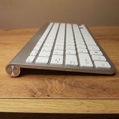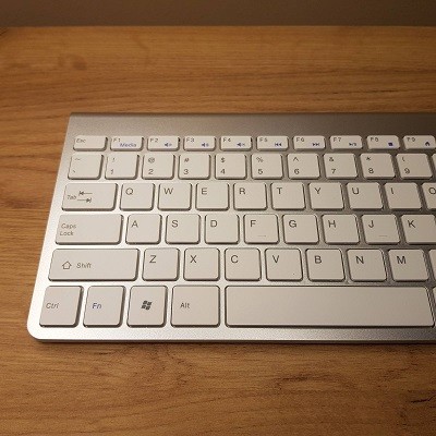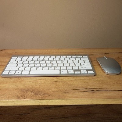 Bežična tastatura i miš. Urađena po uzoru na Apple tastature. Izuzetno lep dizajn, lako se povezuju na sve uređaje. Možete je koristiti i za smart televizore. U mišu se nalazi USB dongl, on je prijemnik i za miš i za tastaturu. U miš idu dve baterije od 1,5 v dok u tastaturu dve. Imaju senzor pokreta, tako da kad duže vreme ih ne koristite, odu u sleep mod i ne troše baterije.