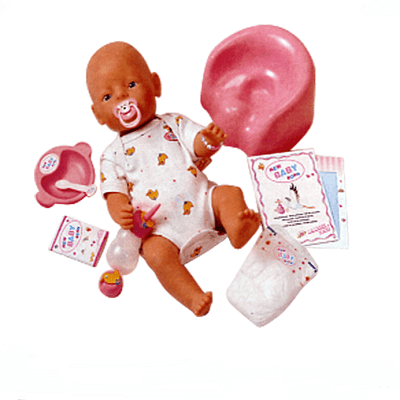 Lutka može da pije vodu, piški, jede kašicu i kaki. Pritiskom na levu nadlakticu ćuje se zvuk a pritiskom na desnu nadlakticu lutki teku suze.