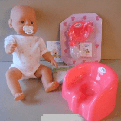 U kompletu dobijate cuclu, flašicu, nošu, pelene, posudu za hranjenje, kašičicu i specijalnu hranu za lutku napravljenu na bazi skroba.